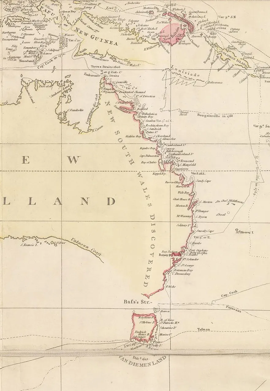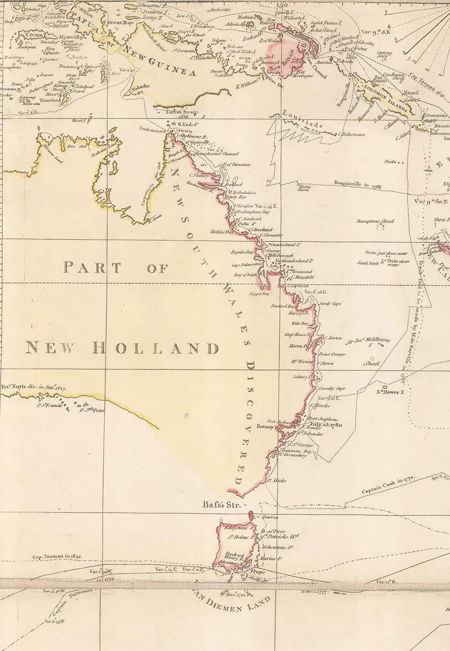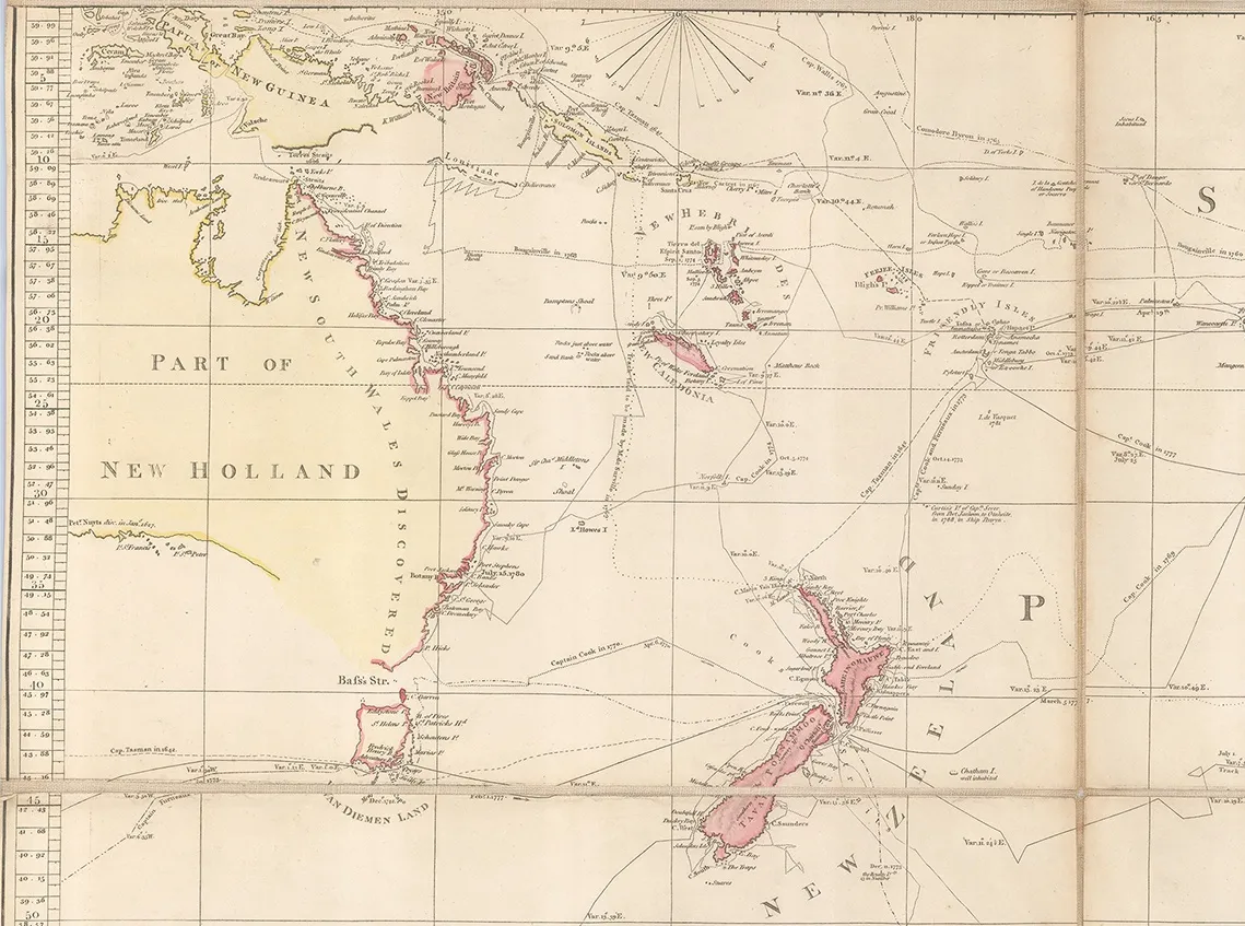 In the title, one of the major points that Arrowsmith emphasizes are the marine voyages of exploration shown on the map. Captain James Cook, unsurprisingly, takes centre stage both on the map and in the title. Cook’s voyages, reports and tragic end made him both a hero and a celebrity to the public at the time. Popularity aside, his voyages also set a new standard for navigation and scientific accounts. It is often forgotten that the official reason for Cook’s first voyage was to record the transit of Venus over the Pacific. His search for New Holland or modern Australia was under sealed orders and not revealed even to him until he was at sea.