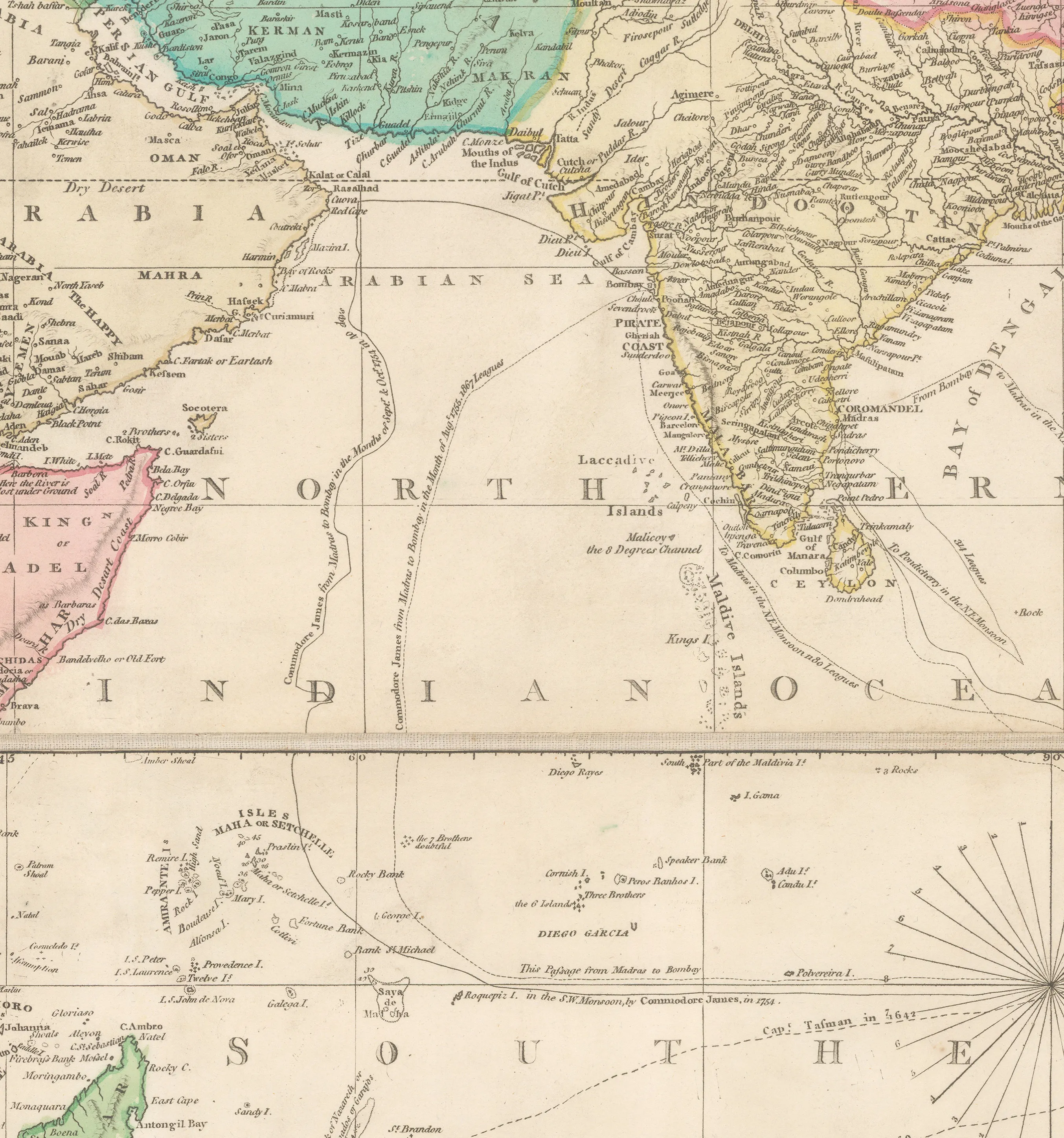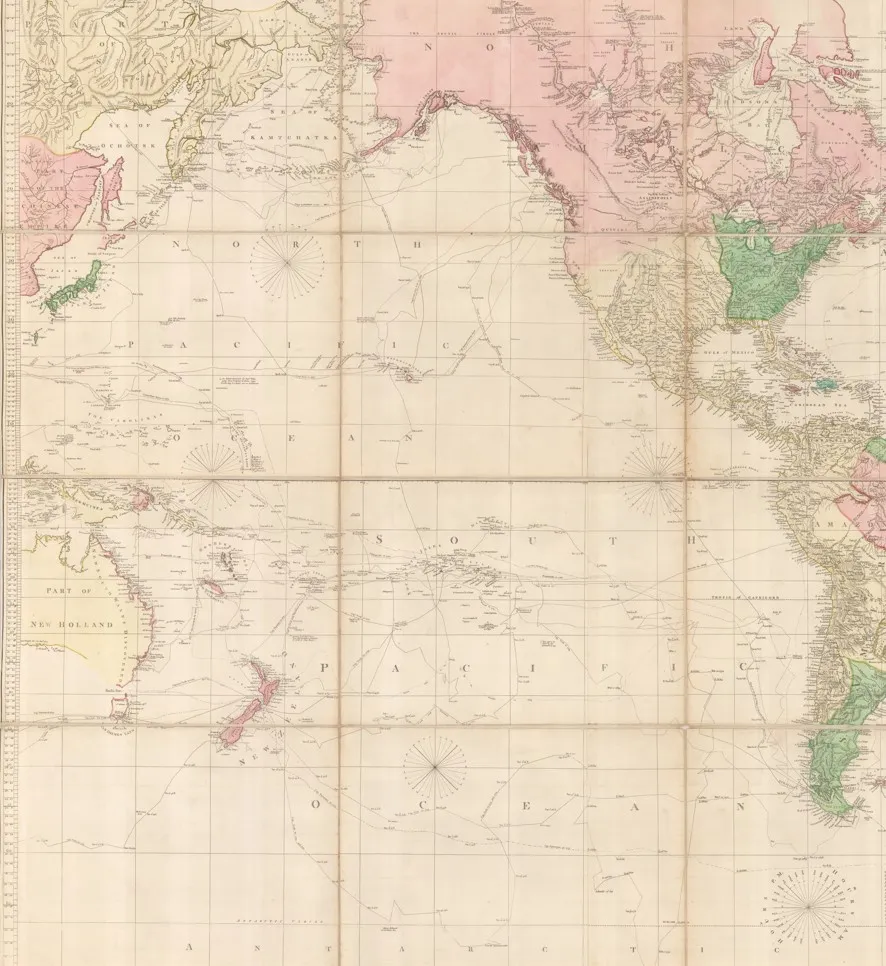 Asia again is sourced from multiple map makers, such as D’Anville for China, and van Keulen for the Dutch East Indies, explaining the lack of interior detail as the latter was mostly a chart maker. As marine commerce was the primary aspect of this region, that is where the emphasis on the map lies, with the Straits of Malacca, Singapore and Sunda together with the routes through them, clearly marked. Arrowsmith was able to rely on the maps of the British East India Company, especially those by James Rennell for his portrayal of the geography of the sub-continent. This was first-hand information and allowed Arrowsmith to draw a highly accurate rendition of the area. Further north, in Tartary, Arrowsmith uses the account of a truly extraordinary journey by Jean-Baptiste Barthelemy de Lesseps, who was one of three surviving members of the ill-fated circumnavigation of the Comté de La Perouse.