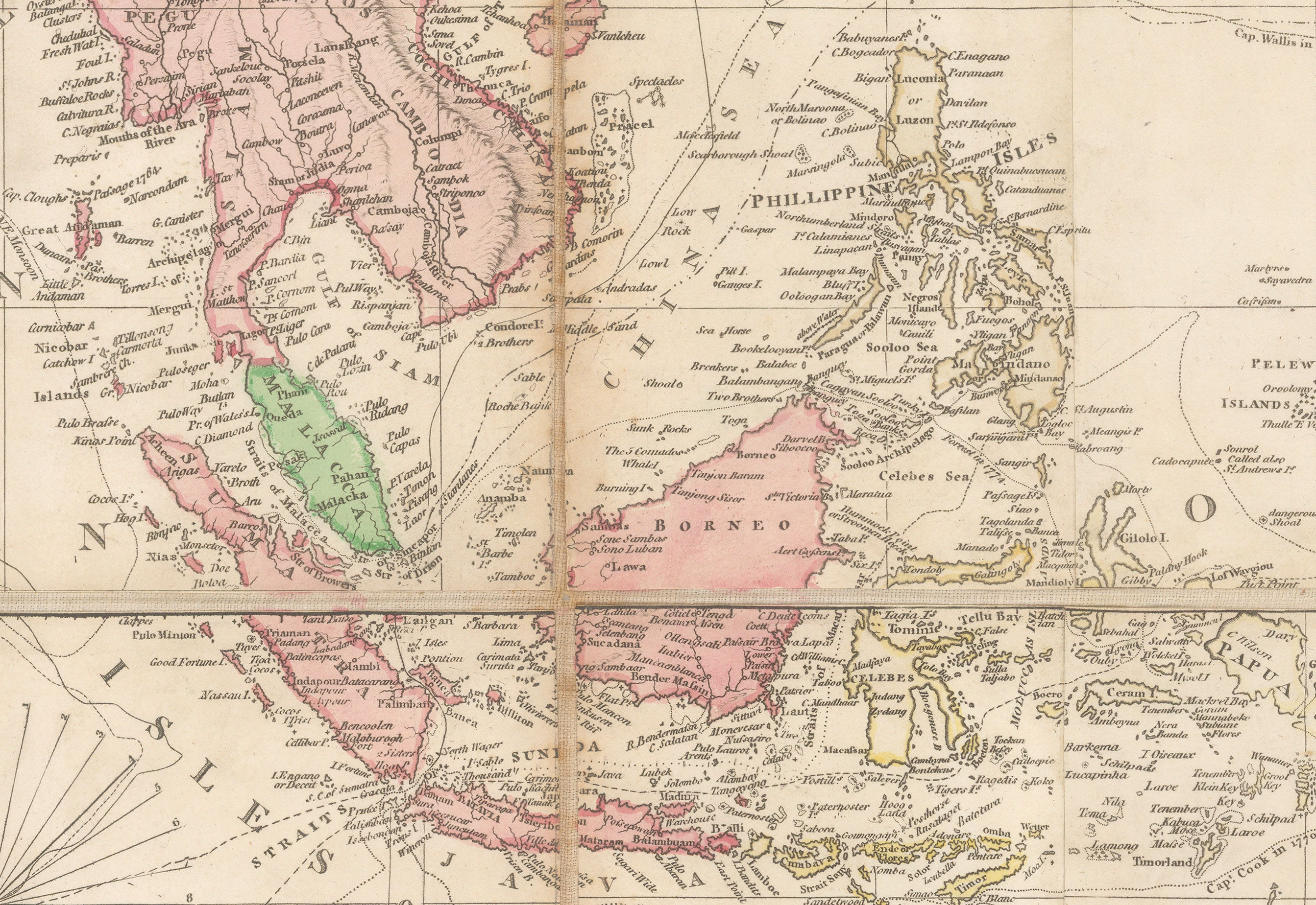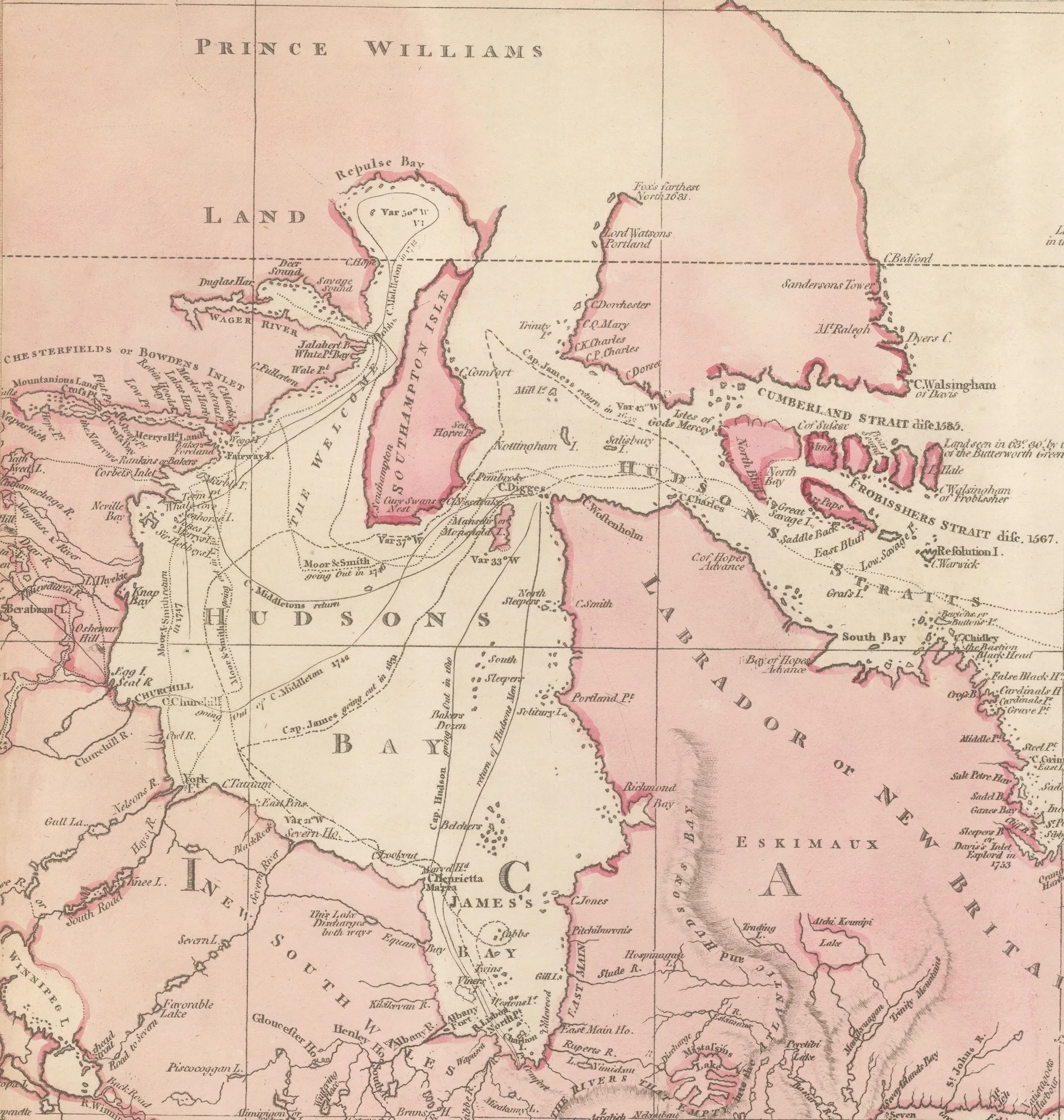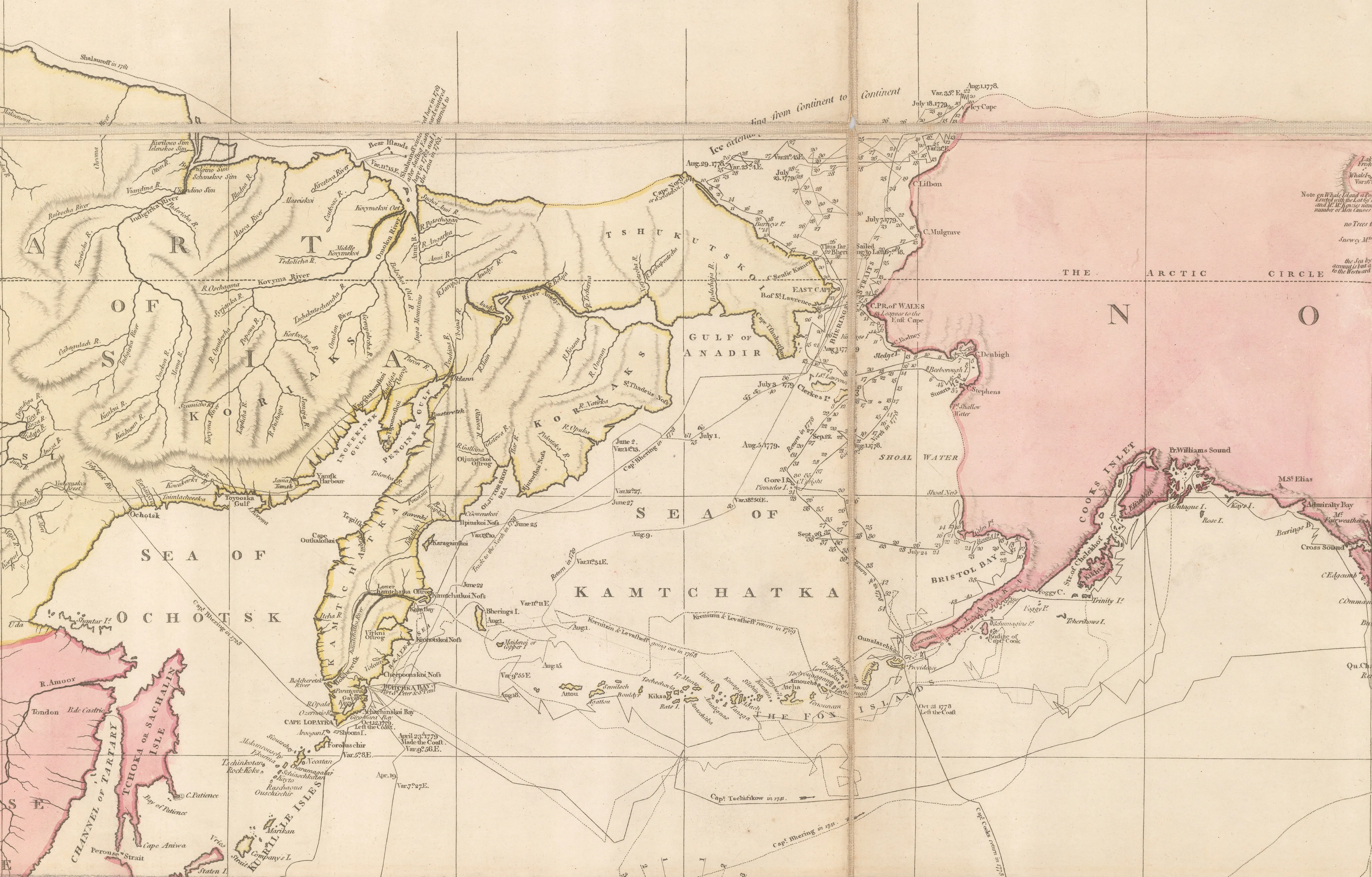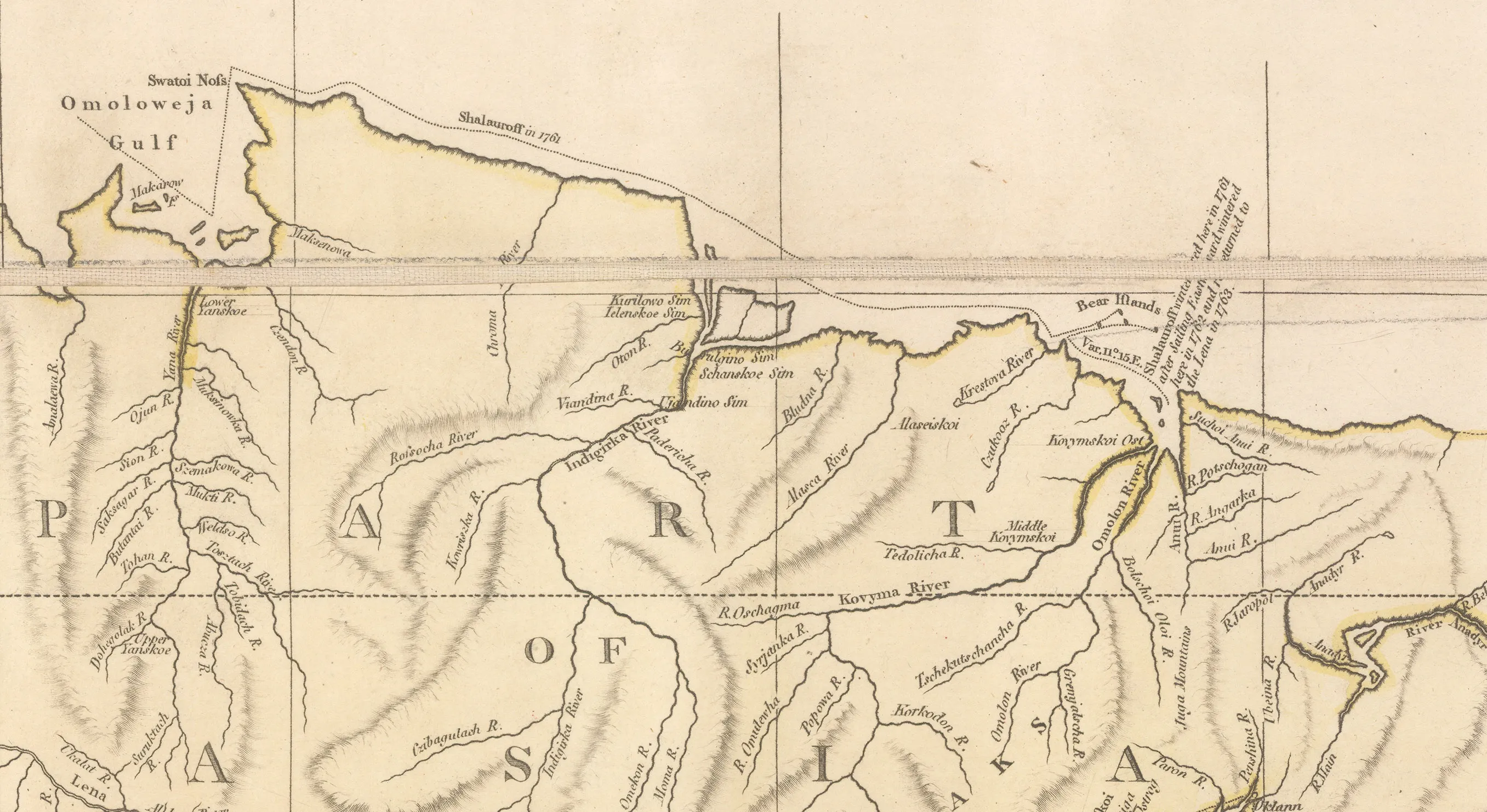 On the northeast coast of Asia, the map shows the obscure Polar expedition of the Russian explorer and merchant, Nikita Shalaurov, who was looking for the Northeast Passage. He failed in his attempt of 1761 so, unrecorded on this map, he tried again in 1764 and perished in the attempt.