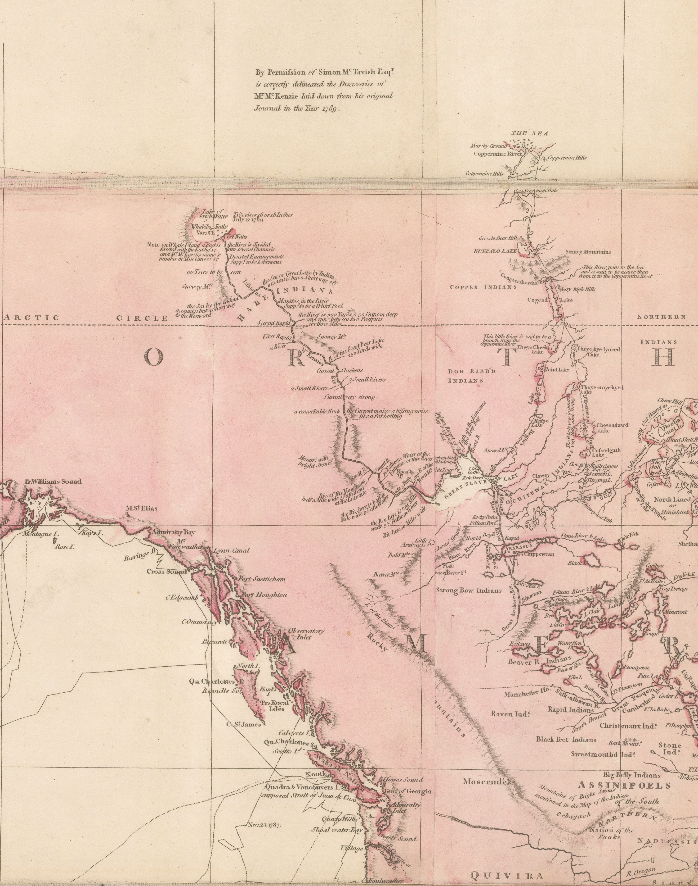 This note refers to Alexander Mackenzie’s exploration of northern Canada in what became known as the Mackenzie River Expedition of 1789 and in which Mackenzie followed a large river in the American Northwest, known to the local people as the Dehcho, hoping it would lead him to the Northwest Passage. It did not but it did lead him to the Arctic Ocean, emulating Samuel Hearne’s epic journey of 1772, along the Coppermine River. Simon McTavish was one of the founding members of the Northwest Company under whose auspices Mackenzie conducted this expedition. Somehow, Arrowsmith convinced McTavish to let him both examine and publish the route from Mackenzie’s diary on his map before the official publication of the report in 1801.