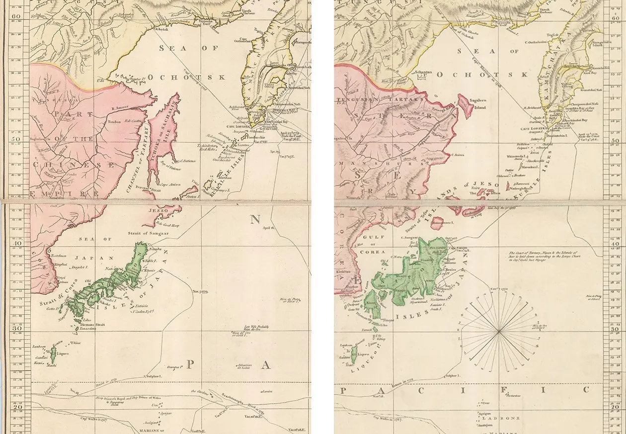Additionally, although the difference between Japan is the most startling, there are other major differences between the two sides, such as the depiction of Sakhalin Island, New Guinea and detail on the east coast of Australia.