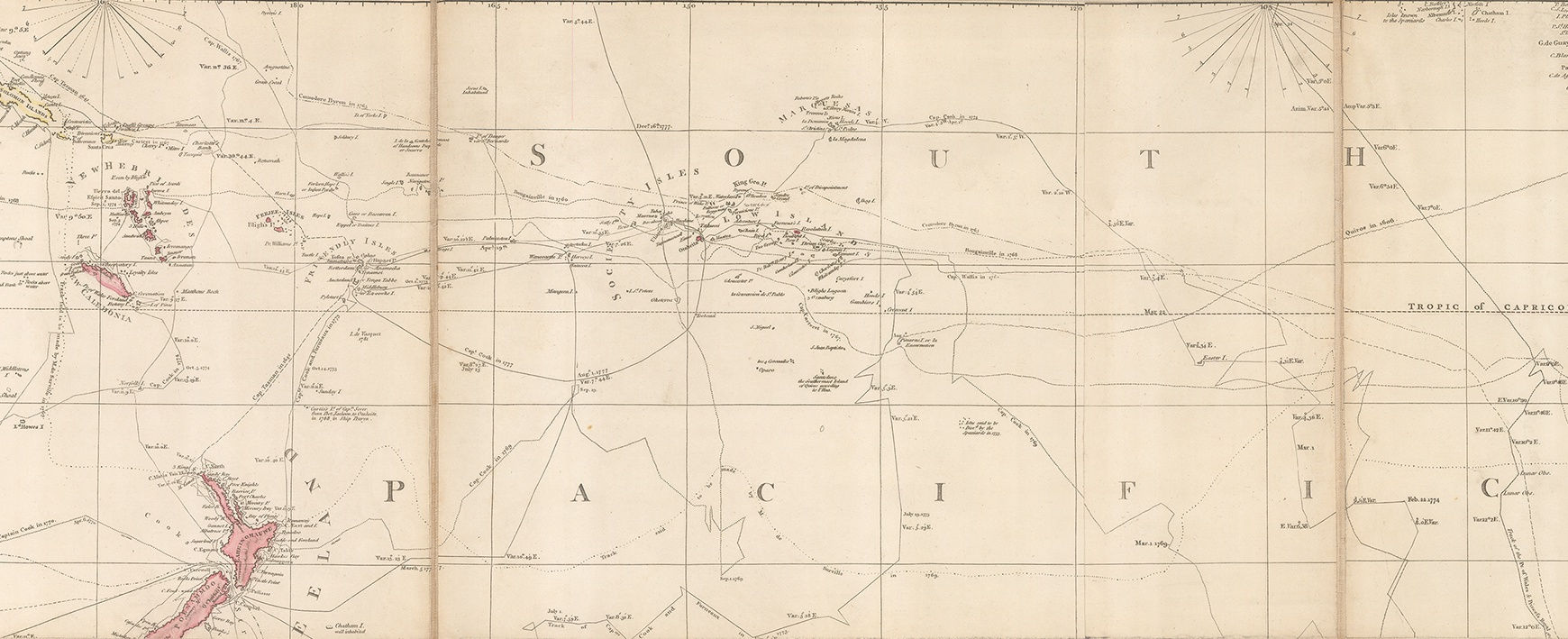 The Pacific shows several lesser known voyages of exploration such as the recent circumnavigation by Captain Philip Carteret in 1766-9; the track of Captain Tobias Furneaux, captain of H.M.S. Adventure who accompanied Cook on his second voyage but who was separated from the Resolution on two occasions and made several important Pacific discoveries, such as an early report on the southern coast of Tasmania. A curiosity is the early voyage of Pedro Fernandez de Queiros or Quiros, who in 1605-6 led a voyage in search of Terra Australis. It is believed he landed in modern Vanuatu, which he named “Australia del Espiritu Santo” or “Australia of the Holy Ghost” and Quiros himself was convinced that he had landed on the huge, uncharted southern continent often drawn amorphously on maps of the period to integrate multiple reports of land sighted in the far south by Spanish, French, Dutch and Portuguese mariners. Terra del Espiritu Santo continued to be a regular cartographic feature on early maps of Australia and the surrounding islands before Cook’s discoveries.