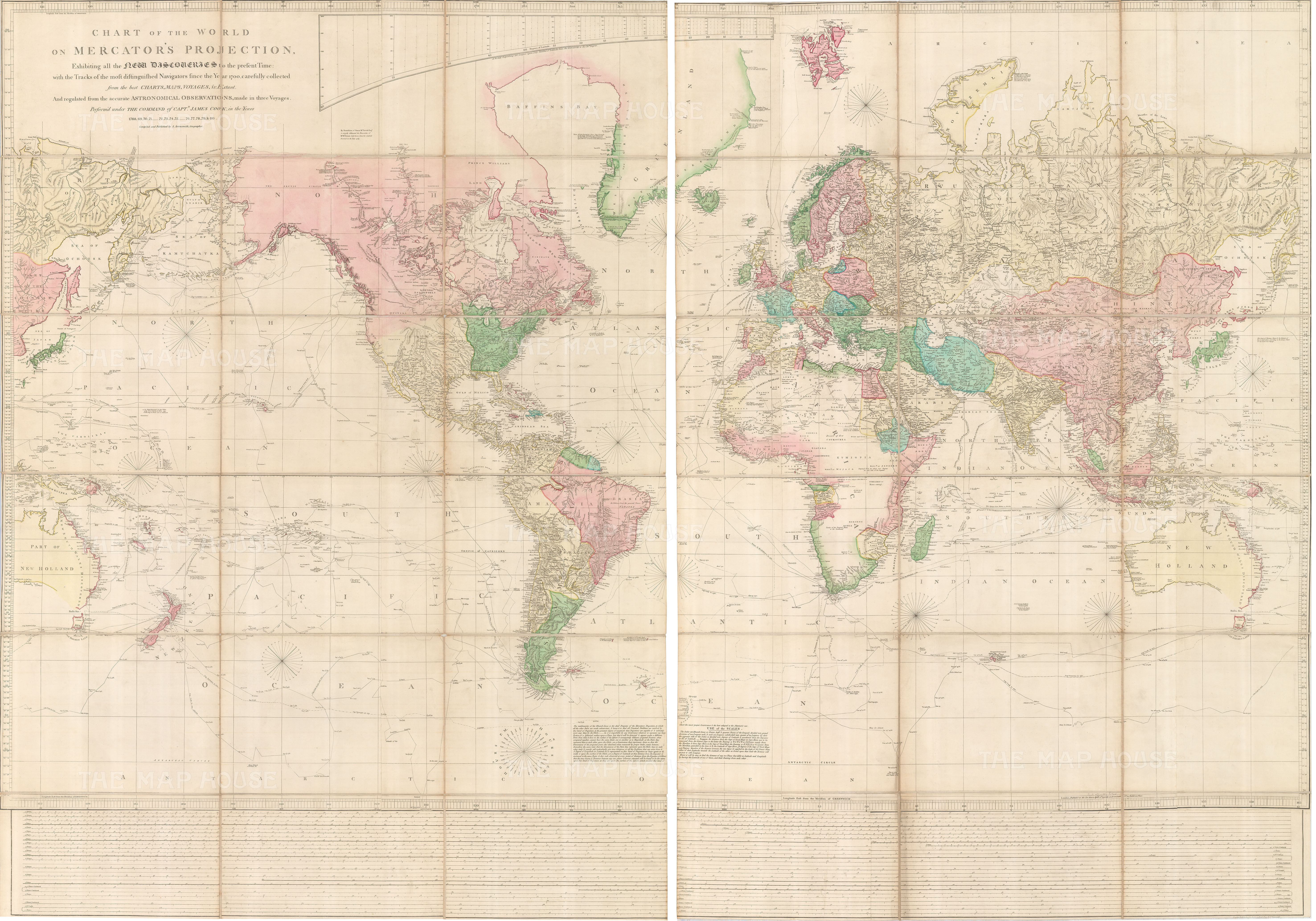 “A Chart of the World on Mercator’s Projection Exhibiting all the New Discoveries to the Present Time; with the Tracks of the most distinguished Navigators since the Year 1700 collected from the Charts, Maps, Voyages & c: and regulated from the Astronomical Observations made in three voyages: Performed under the Command of Captain James Cook in the Years……..” was Arrowsmith’s first map and set the exacting standard which established the reputation of the firm. It was linen backed, segmented and on two sheets. Its size immediately promoted it as a prestige piece and it must have been highly successful as it went through seven printings that have been traced between 1790 and 1808. Although, for the reasons mentioned above and due to the last reliable comparative survey being published in 1967, trying to trace the printings and the numbers of each is an inexact science. The printed date of 1790 on the map does not change, but the issue date can be traced both by the address of the imprint on the map, as the firm changed location several times during its existence and even more by the geographical detail.