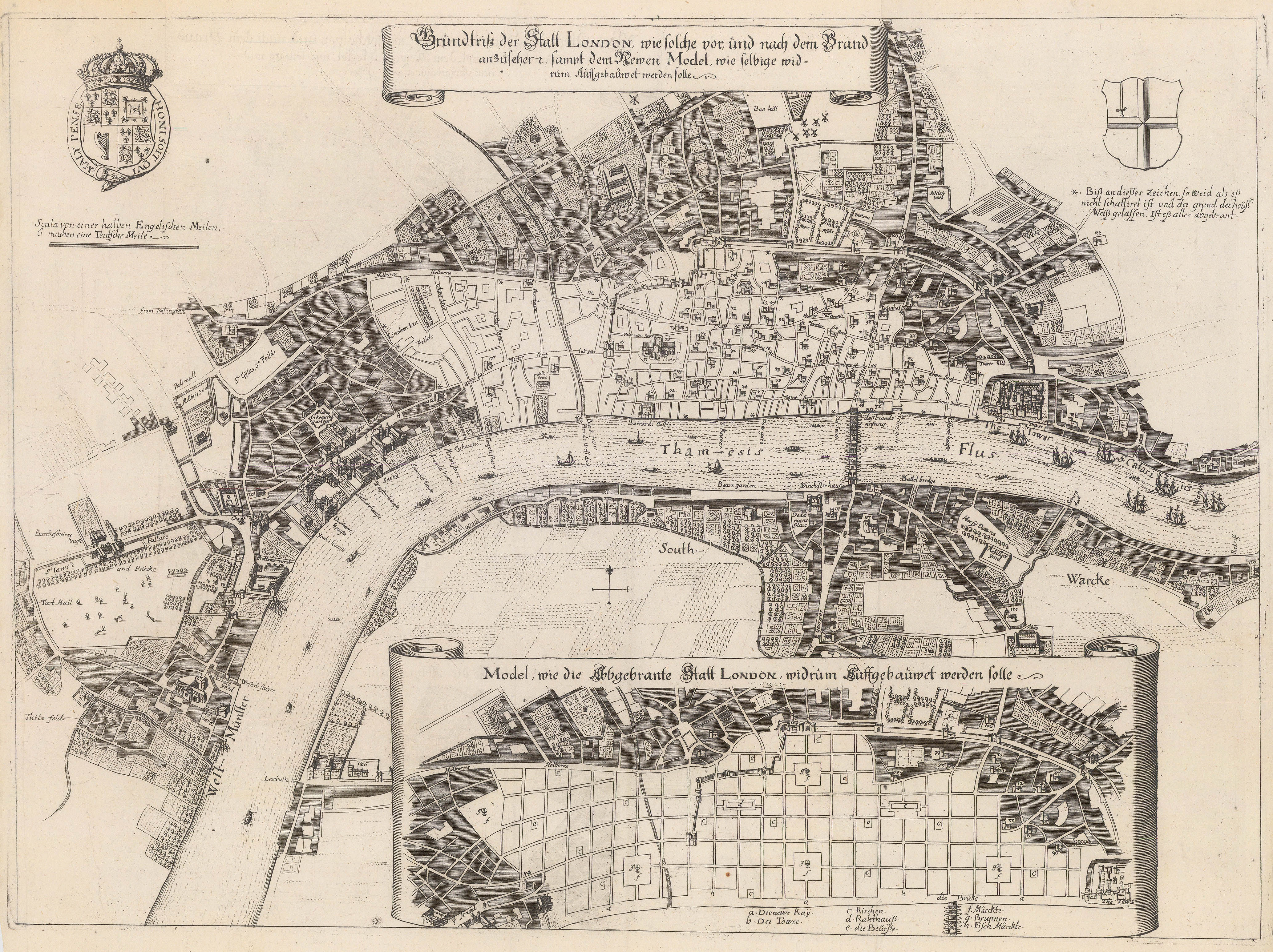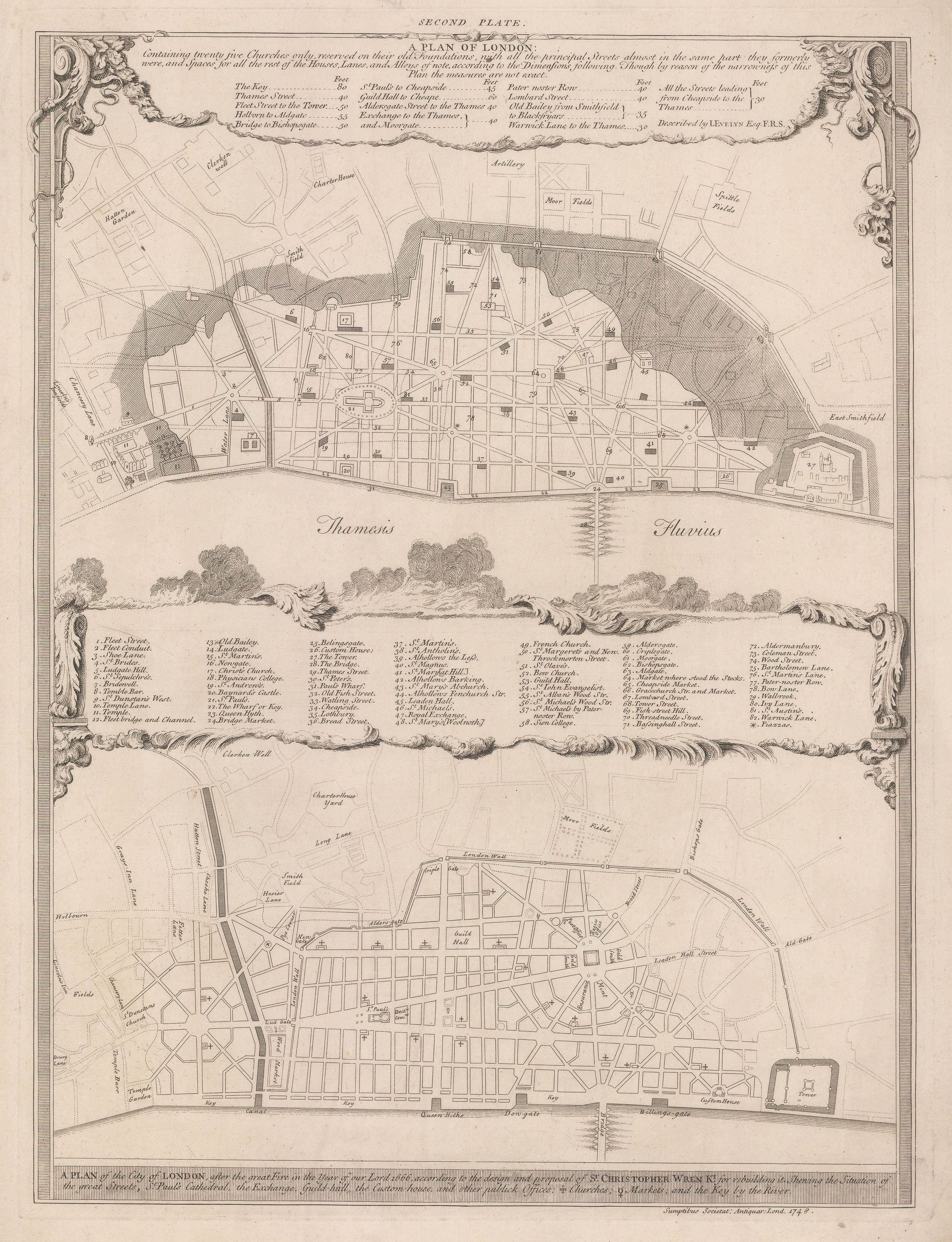 These comparative maps were published in 1748 by the Society of Antiquaries to record the plans which had been submitted almost a century earlier. Coincidentally, during this year another major fire broke out in the City of London.