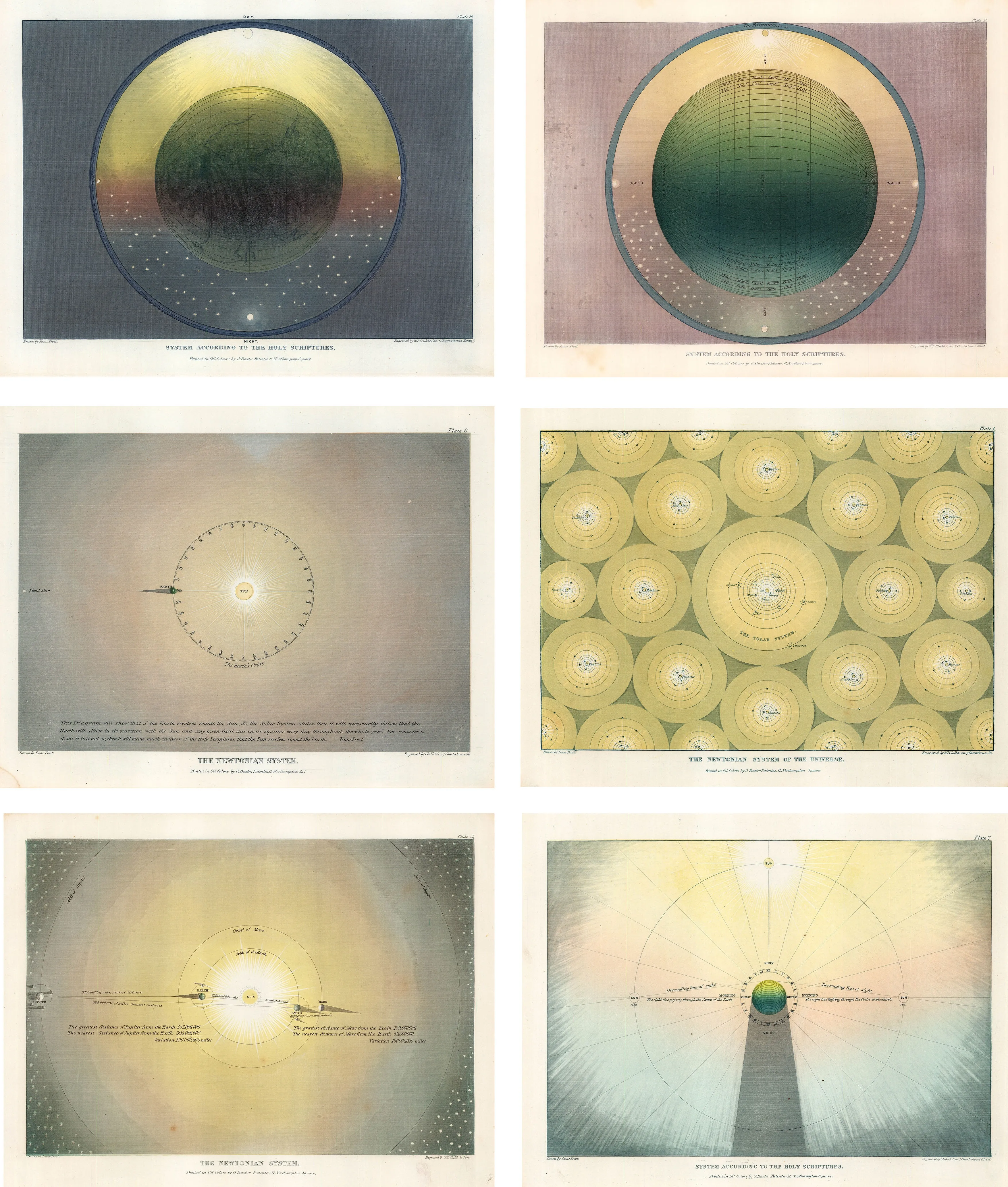 The plates, first issued under the title Two Systems of Astronomy, illustrate the "The Newtonian System of the Universe", and "The System According to the Holy Scripture", the text caption on plate 6 reading "This diagram will show that if the Earth revolves round the sun, as the Solar System states, then it will necessarily follow, that the Earth will differ in its position with the sun and any given fixed star on its equator, every day throughout the whole year. Now consider it is so. If it is not so, then it will make much in favor of the Holy Scriptures, that the Sun revolves round the Earth."