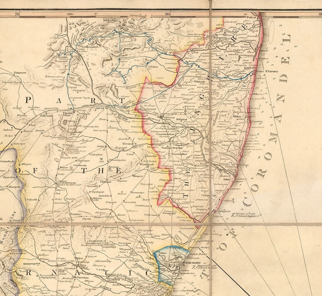 The surveyors on the map are Col. Kelly and Capt. Wersebe. The former is mentioned in several contemporary sources as having a great many surveys of the Carnatic, some of which were used by Coote during his campaign. Capt. the Baron Hermann von Wersebe is mentioned by Major James Rennell, the Surveyor-General of Bengal, as a source for his own cartography.