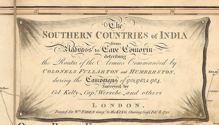 It is a spectacular folding map which illustrates the theatre of a conflict which became known as the Second Anglo-Mysore War featuring the armies of the British East India Company facing the forces of Hyder Ali and his son Tipu Sultan of Mysore. It was printed for William Faden in 1791 and sold at his premises. Faden was a very successful map maker, who took advantage of the public thirst for knowledge about affairs in the far flung corners of the newly burgeoning British Empire and as the Third Anglo-Mysore War was being fought during the period that this map was issued, he was almost certainly taking advantage of the zeitgeist.
