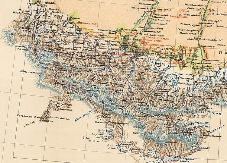 As can be seen from the red route on the map, Stein made his way through Leh in Kashmir and then re-visited Ancient Khotan; the map records a mixture of extraordinary geographical detail together with the superimposition of archaeological and ancient sites, again marked in red. This is archetypal Stein, whose topographical accuracy was legendary and remains one of the main reasons why his work is still valid to this day.