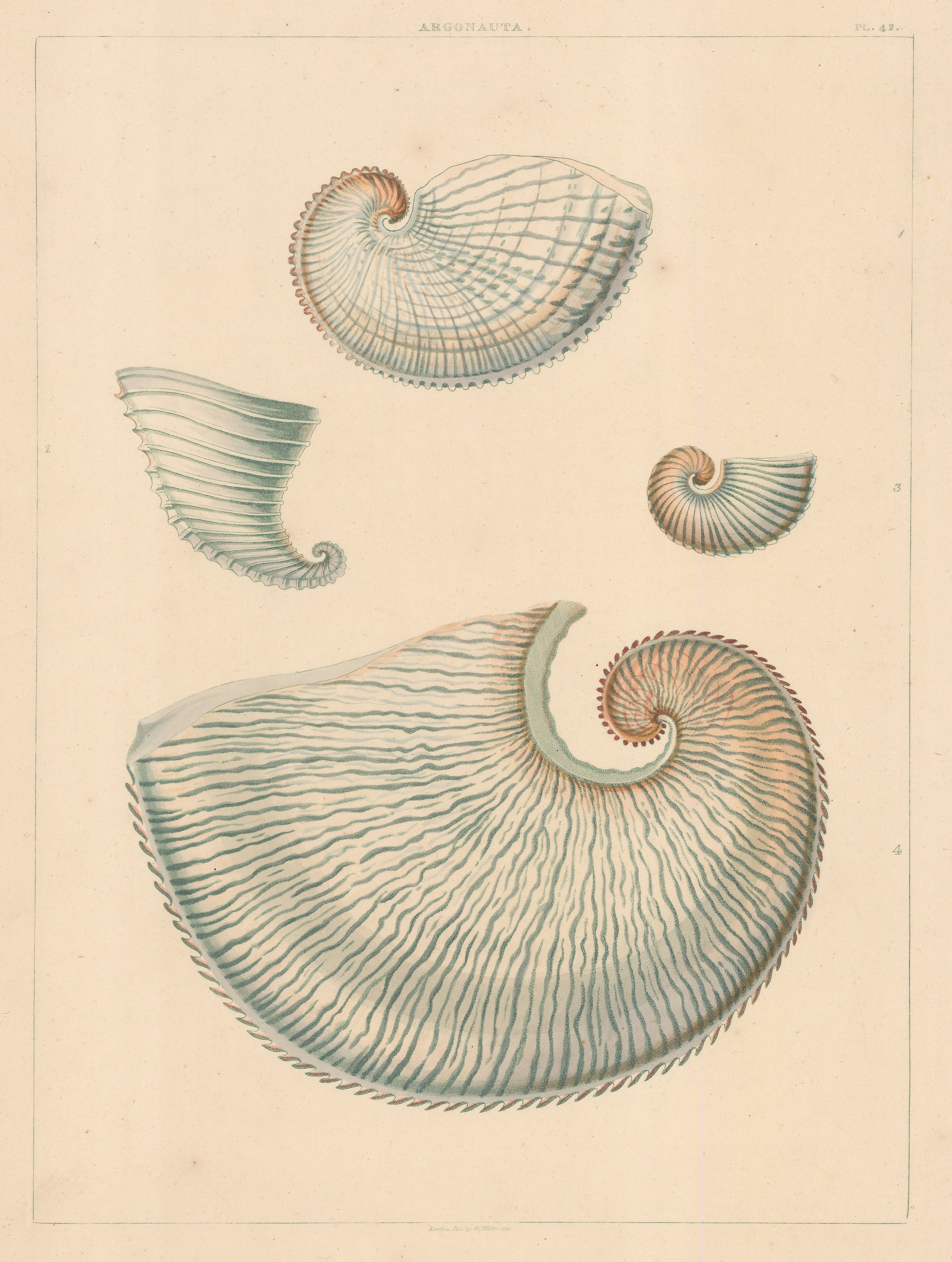 George Perry. An original hand coloured antique aquatint of Univalves - four varieties Genus Argonauta: 1. Argonauta Vitrea, 2. A. Rotunda, 3. A. Striata, 4. A. Grandiformis. 1810. [NATHISp6040]