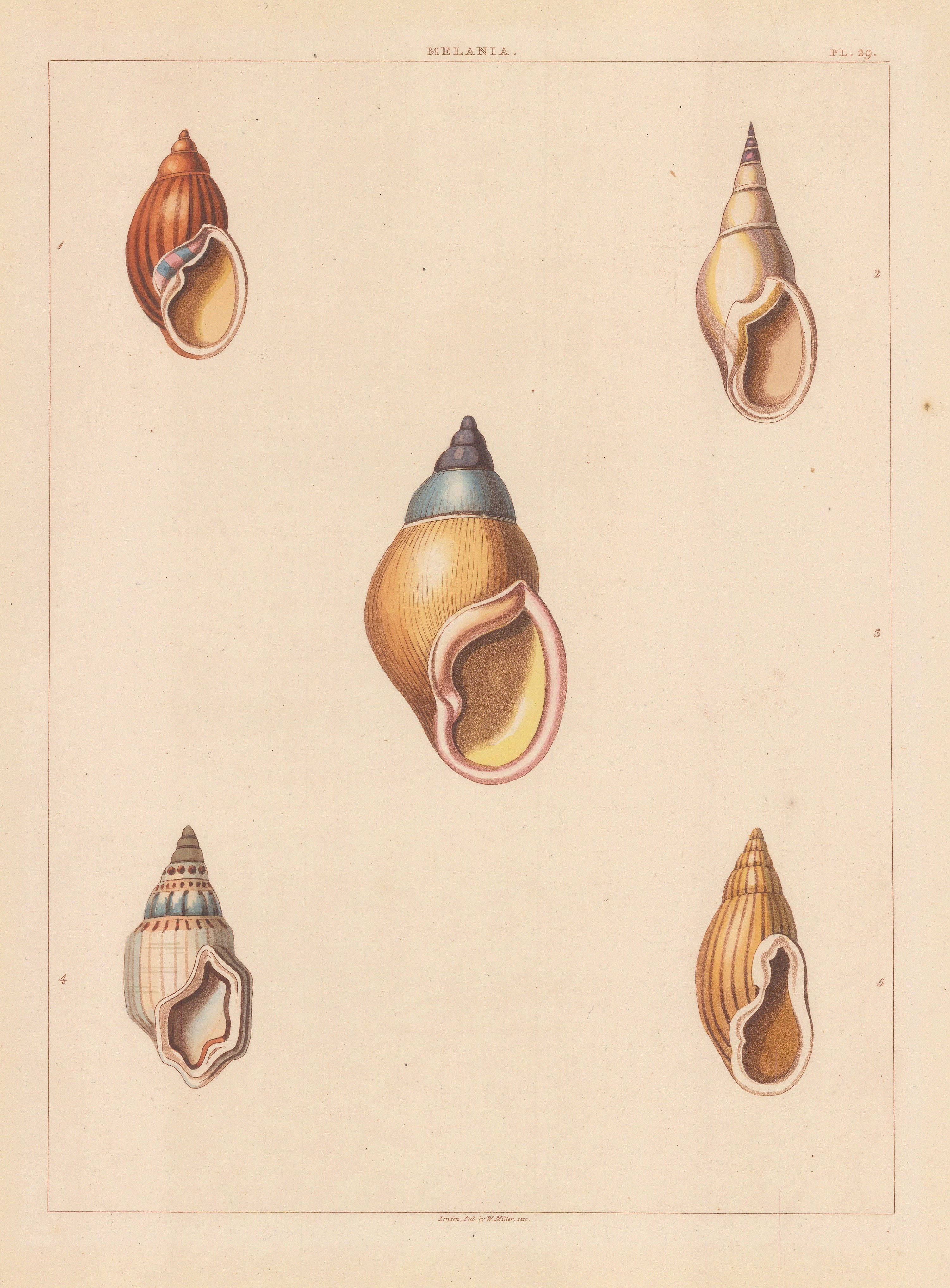 George Perry. An original colour antique aquatint of Univalves: Genus Melania: 1. Melania Aurantia, 2. M. Acuta, 3. M. Carnatis, 4. M. Nonpareil, 5. M. Striata. 1810. [NATHISp6486]