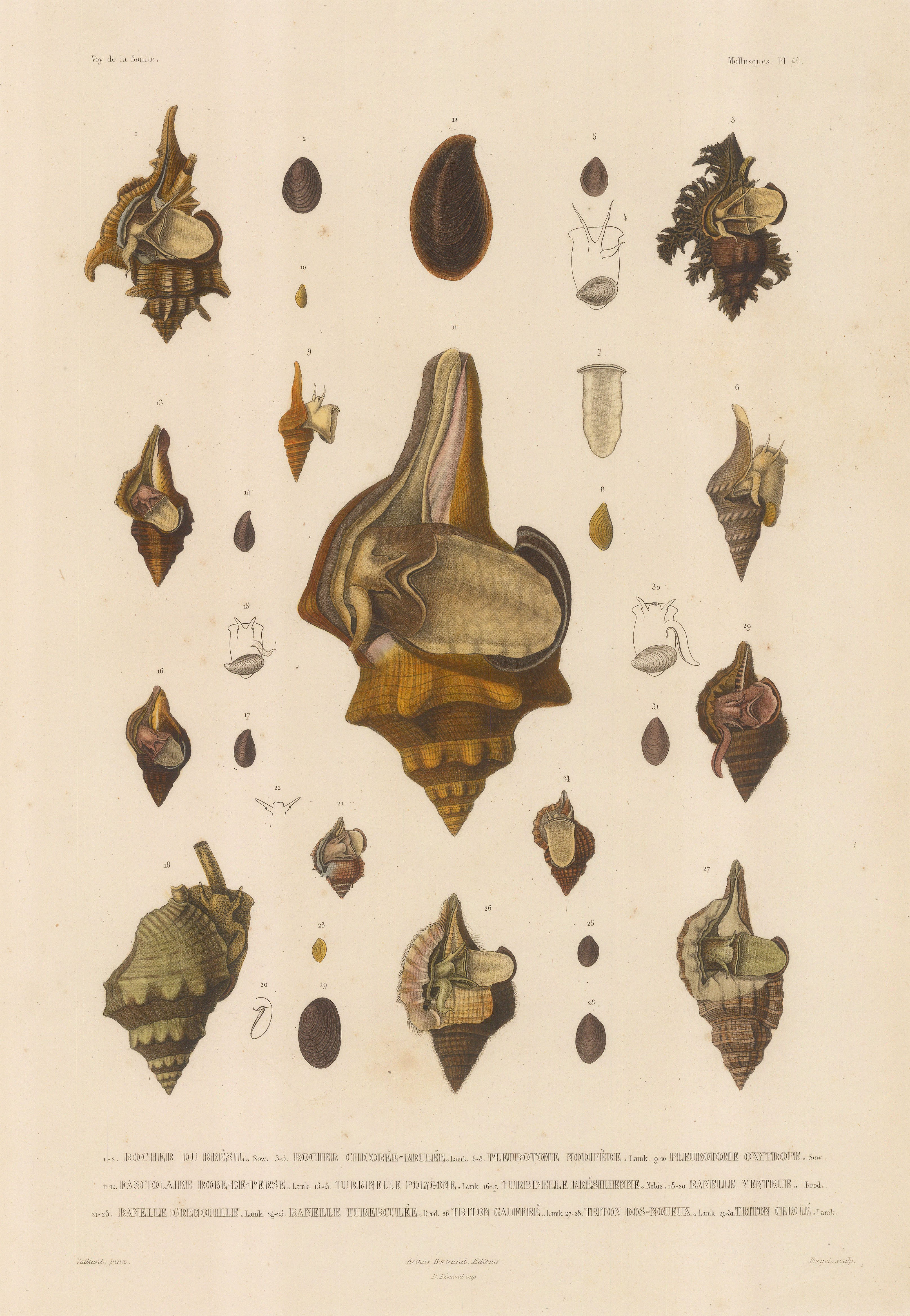 Auguste-Nicolas Vaillant. An original hand coloured antique lithograph of Buccin Fusiforme, Pyrule Trompette, Pyrule Chauve Souris and La Meme: Twelve examples after Vaillant. c.1850 [NATHISp6491]