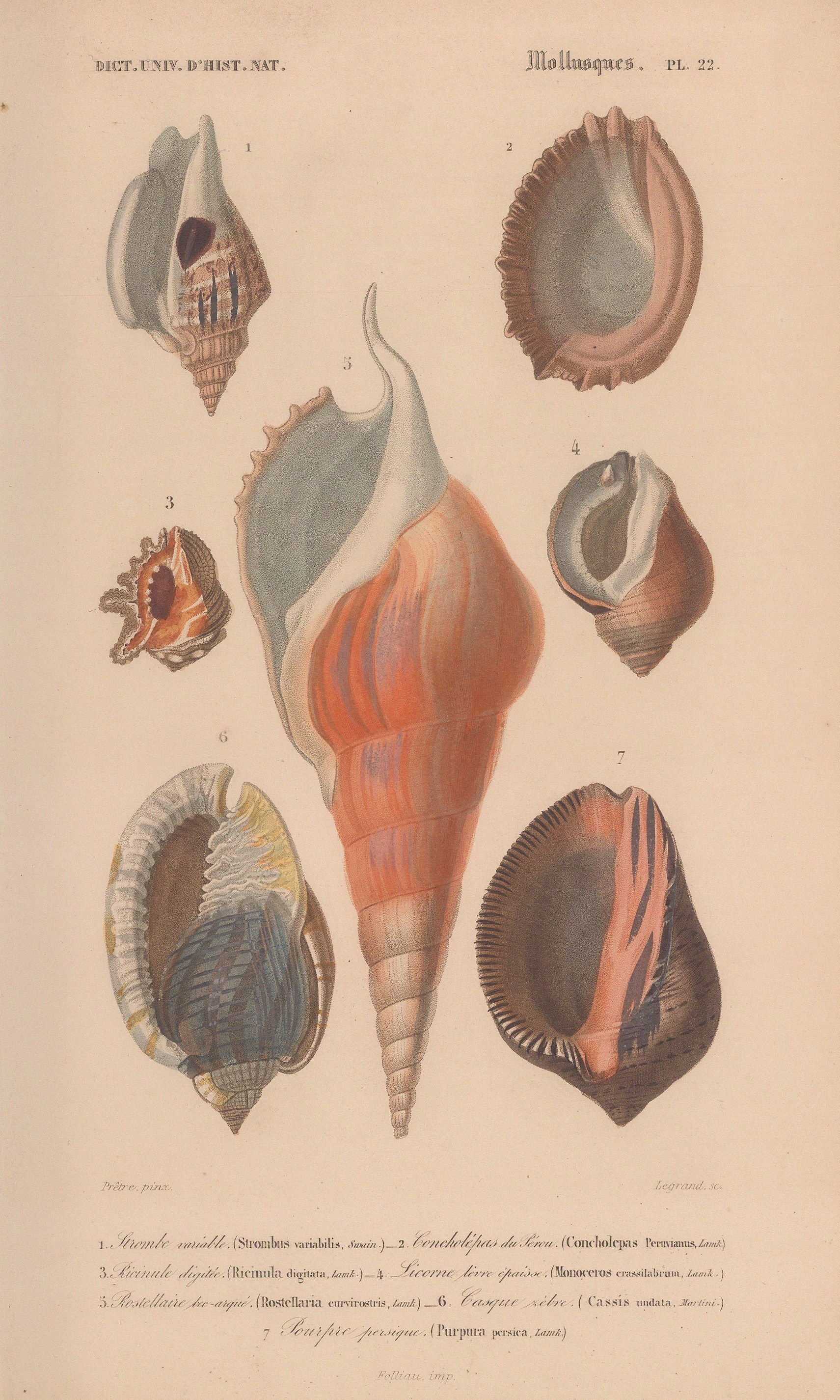 Charles d’Orbigny. An original hand coloured antique lithograph of Strombus - seven varieties of conch and mollusk shells with key, 1849. [NATHISp7771]