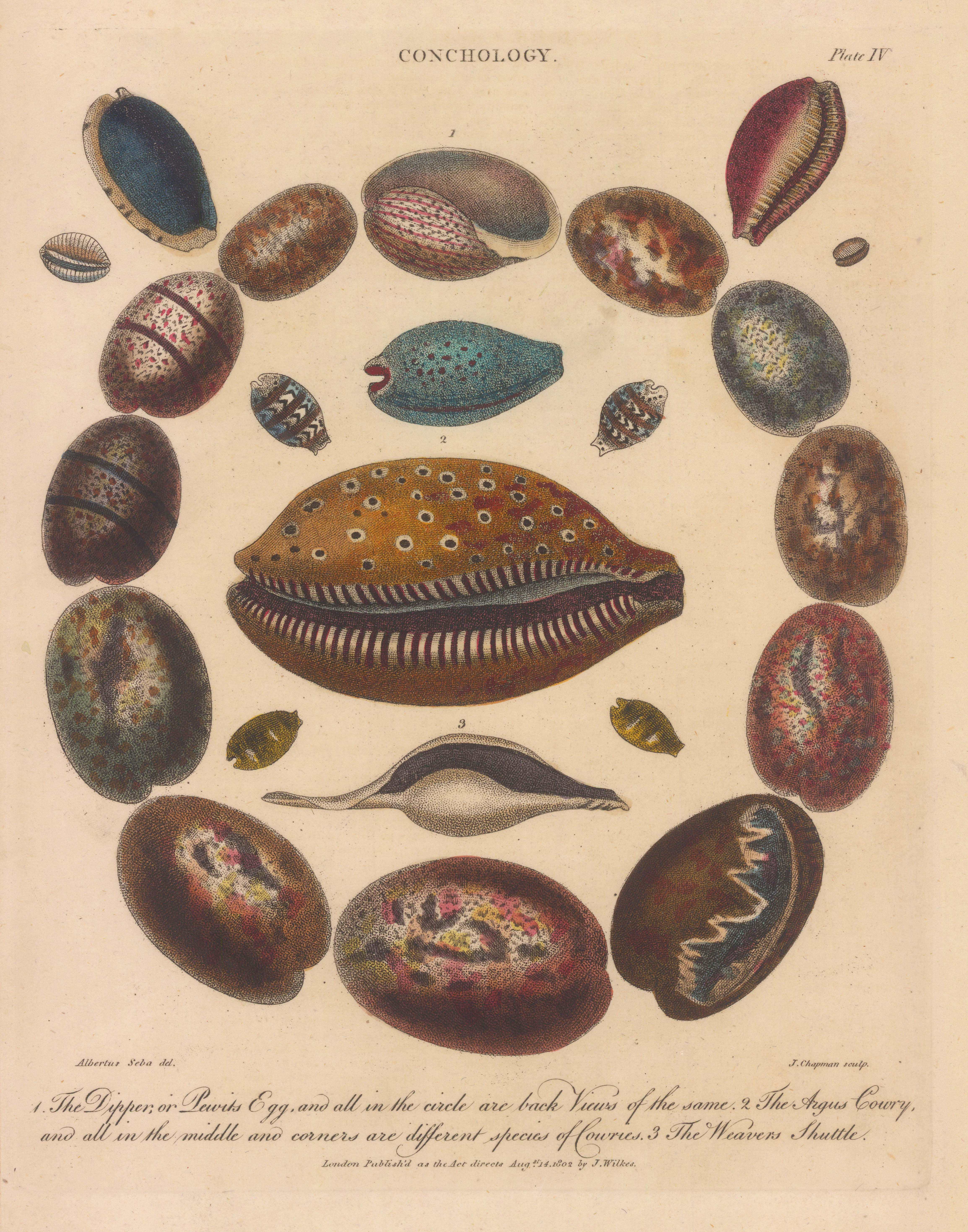 John WIlkes. An original hand coloured antique copper-engraving of Bullae (Pewit’s Egg or Dipper). 12 Dippers, Argus Cowry with 9 Cowries and a Weaver Shuttle. After Albertus Seba, engraved by John Pass. 1810 [NATHISp7825]