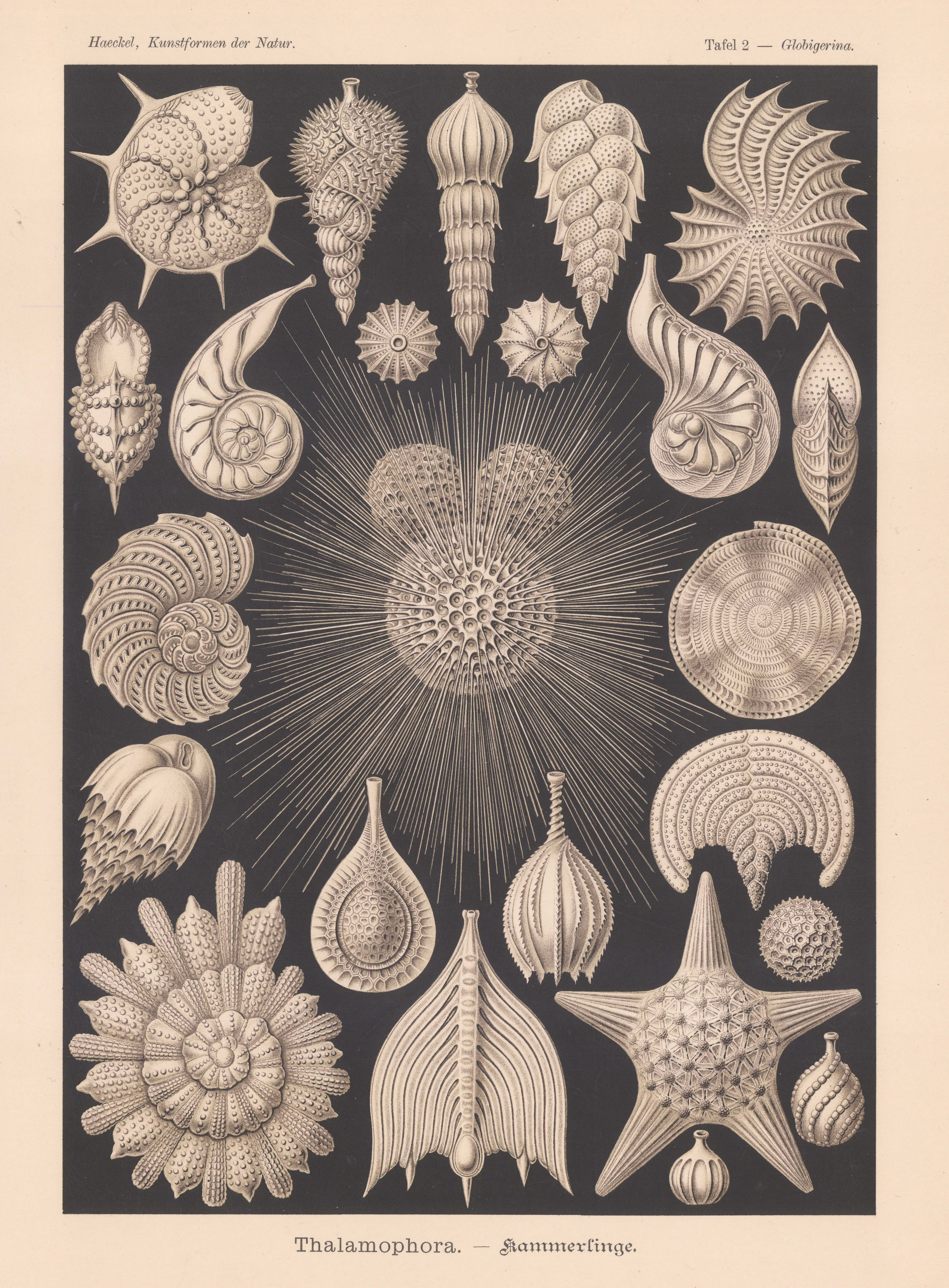 Ernest Haeckel. An original antique lithograph of Foraminifera (Thalamophora). 20 specimens of the shells of mollusc like organisms . 1904. [NATHISp7966]