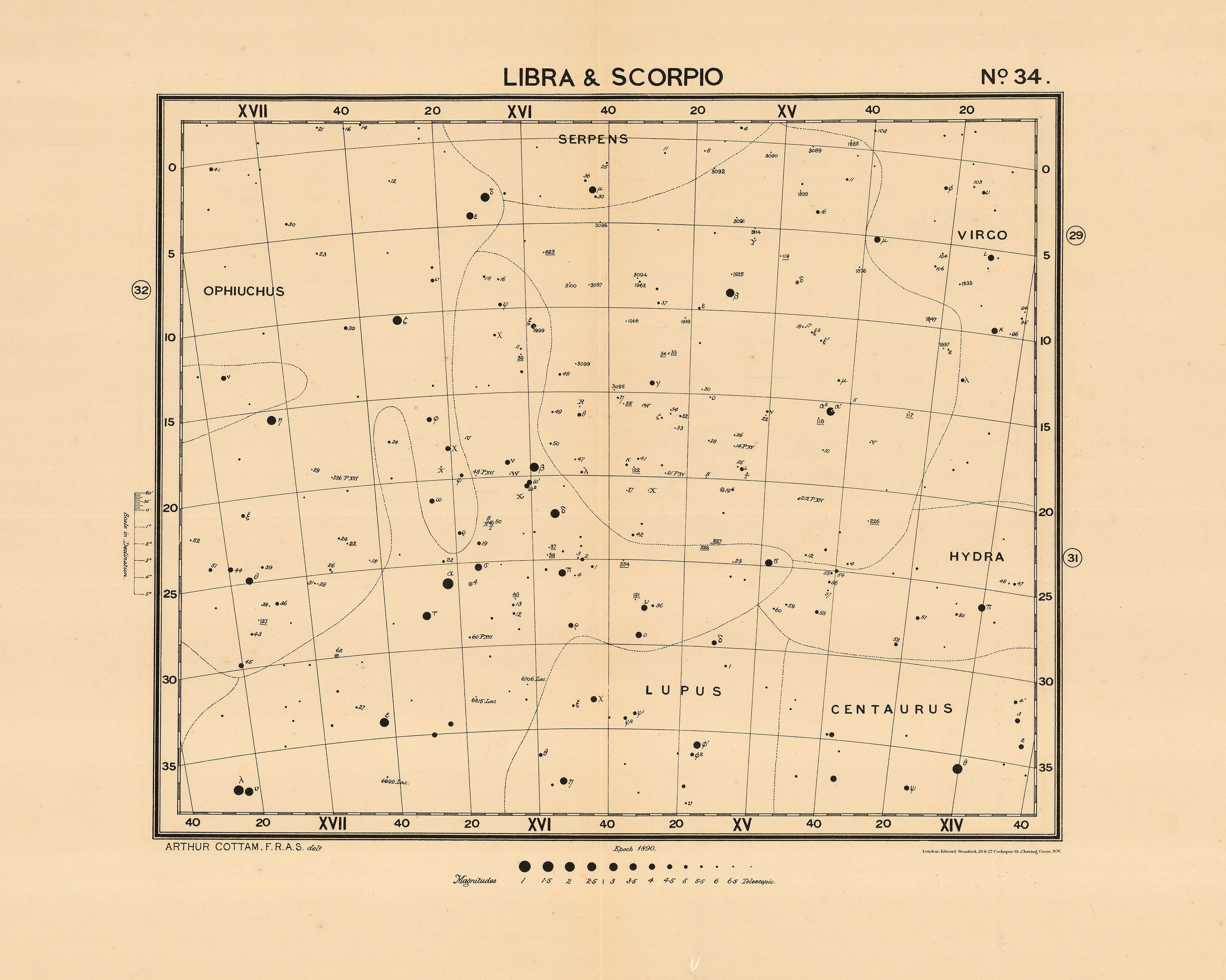 The atlas was entitled “Charts of the Constellations” and comprised of 36 large charts for the amateur and expert astronomer alike. For publication Cottam teamed up with the successful London map maker, Edward Stanford.
