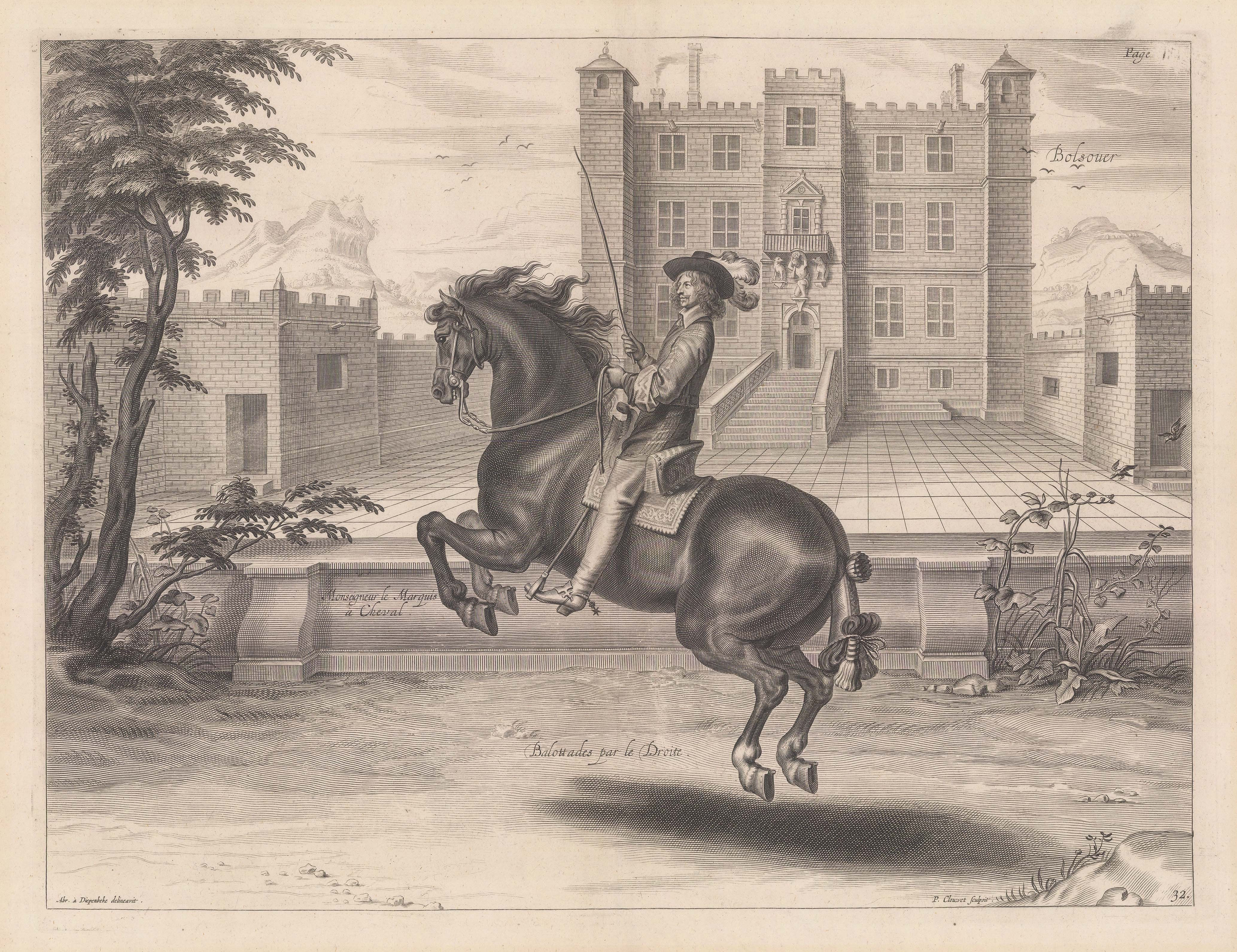 Duke of Newcastle:: Balottades par la Droite. 1743. An original copper engraving. Not published in English until 1743, the influential treatise on Equitation by the Duke of Newcastle was written in 1658 whilst he was in exile in Paris during the Interegnum.